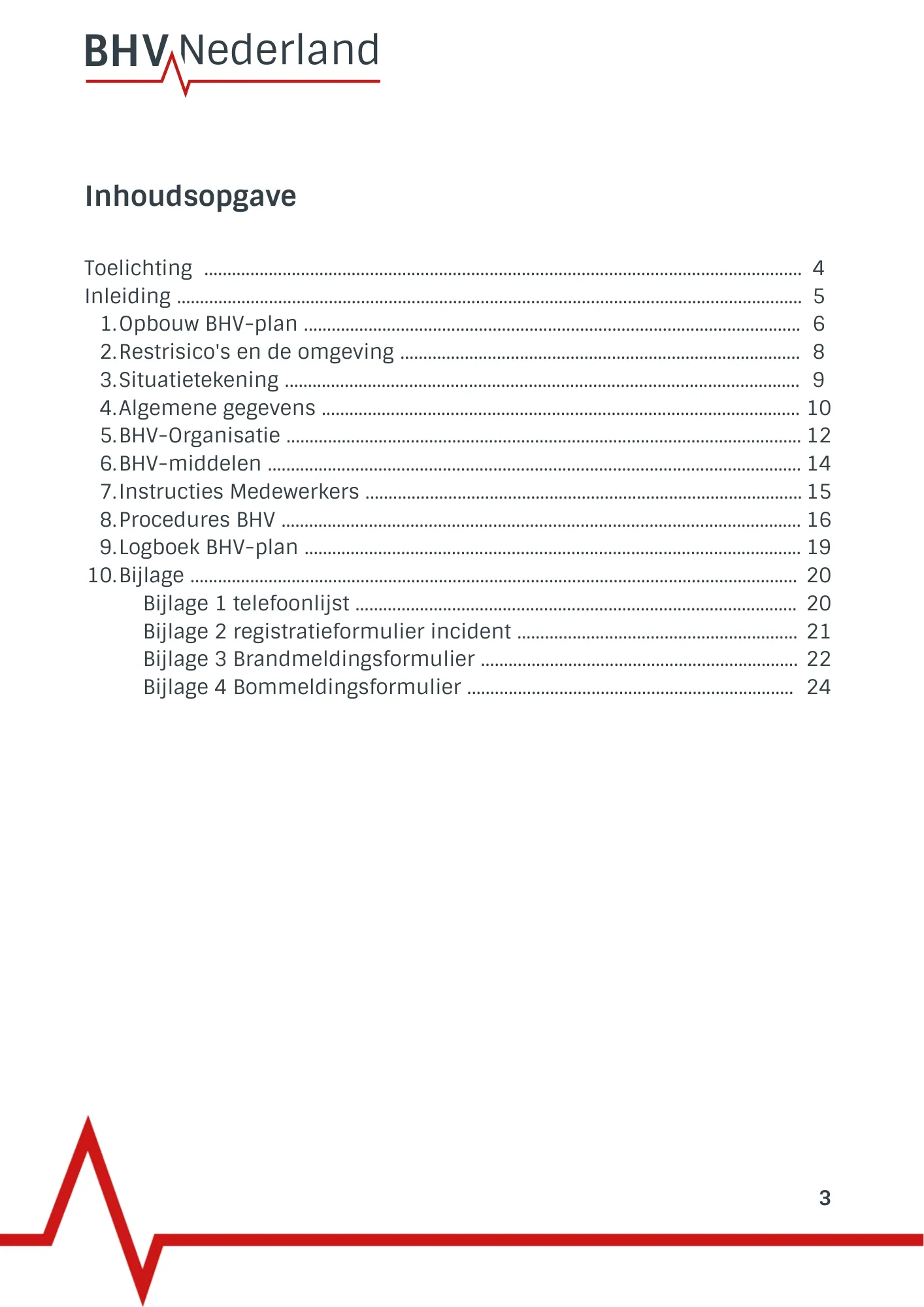 Om een idee te krijgen wat er in een BHV-plan kan staan, hebben wij hieronder een voorbeeld gemaakt. Dit voorbeeld bevat mogelijke onderwerpen van een BHV-plan, dit kan er voor jouw organisatie anders uitzien.