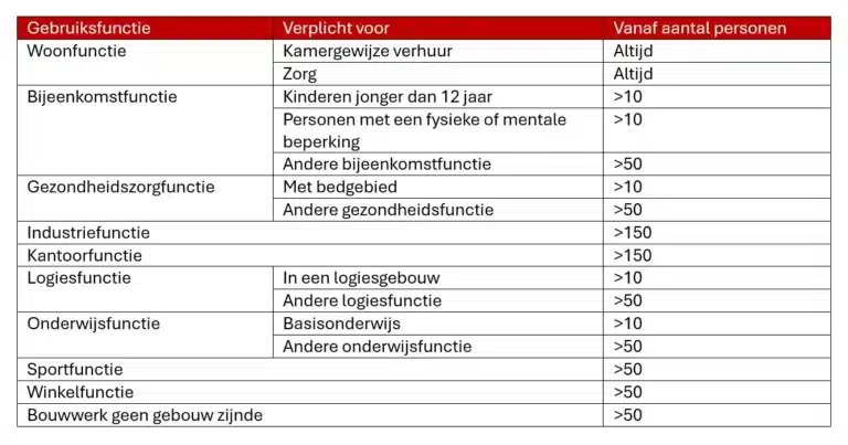 Een gebruiksmelding brandveilig gebruik is verplicht als er meer personen aanwezig zijn, dan toegestaan volgens het Besluit bouwwerken leefomgeving (Bbl). Dit kan bijvoorbeeld gelden voor:
